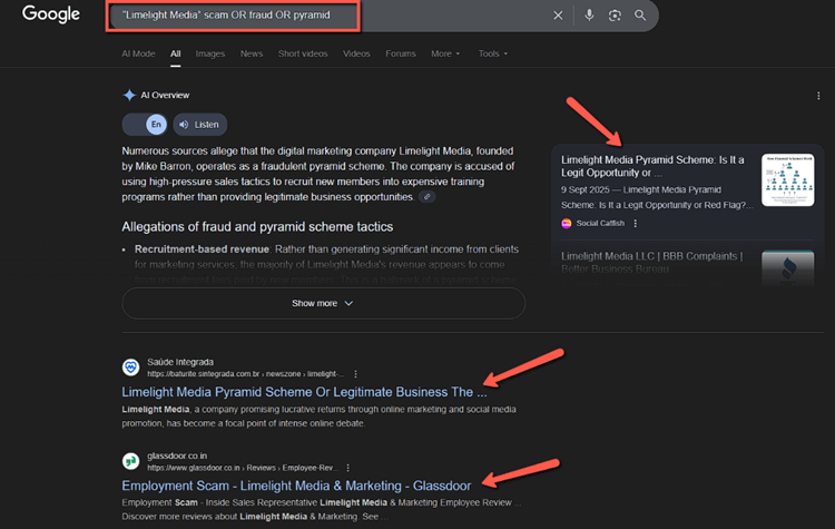 - “Limelight Media” scam, OR fraud, OR pyramid