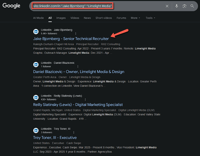 Using LinkedIn and Google together is another useful hack that will help you verify people and businesses. Simply go to Google and type, for example: site:linkedin.com/in “Jake Bjornberg” “Limelight Media” and then look up “Jake Bjornberg” Limelight Media scam OR complaint. If you find any image on LinkedIn or Google, it can also be used for reverse search on Google Images. This trick has helped me several times to track down profiles of people and find out where their images have appeared.