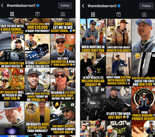 When you go to the social media page of Mike Barron, for example, on Instagram, you will see a lavish portrayal. His wealth is loudly displayed with luxury cars, vacations, designer brands, and more. He also posts luxurious lifestyle habits and stays in high-end hotels, attracting viewers and followers with such flaunting.