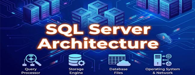 SQL Server Architecture follows a client-server model organized into three core layers: Protocol Layer for network communication, Relational Engine for query processing, and Storage Engine for data management and retrieval.
